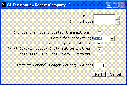 Enter the date range in MMDDYY format. You would normally enter the first day and the last day of the month, but you can post more often if desired. Include Previously Posted Entries A posting code will be placed in each transaction as it is posted to the General Ledger, so you can not inadvertently post a transaction twice, even if the transaction it is in the date range you choose. You can re-post any transactions by answering with a "1" to this question. Enter a blank or zero for normal posting. This distribution listing will not place a posting code in the records, but if the entries have already been posted, you must answer that you want to include previously posted entries. Print Distribution Listing We recommend you always print a Distribution Listing. This will be your record of everything that was posted during the run. Cash Basis or Accrual Basis You must decide if you want your books posted on a cash basis or an accrual basis. You must always be consistent in how you answer this question! Under a cash basis, the system will only post the expenses that were paid this month. Under an accrual basis, the system will post all invoices that were dated this month even if they have not been paid. If you do not know how your books are currently being posted, you will need to discuss this with your accountant. You cannot change back and forth between methods. If you have an accounts payable account in your General Ledger and the account has a balance, you are most likely on an accrual basis. Combine Payroll Entries Payroll checks will be written to the Checkbook system from payroll. You will get individual entries for each withholding account. As you can imagine, these entries can waste several pages of print in your General Ledger trial balance. If you want the payroll entries summarized by pay period, be sure to check the box. Update After The Fact Payroll Records The ACS General Ledger system has an option to maintain earnings records for employees. Payroll reports and W-2s can be printed from these files. Normally you would not be maintaining these files, but if you are, the system can update the earnings records for any payroll checks written during the month. General Ledger Company Number to be Posted to You can have up to 99999 different companies in the Checkbook system. Sometimes with multiple funds or for other reasons, you may have several checkbook companies setup that should all post to the same company in General Ledger. You have this option. The Company Number to which you are assigned will be automatically displayed, but you can post the Check Book system to any company. | |