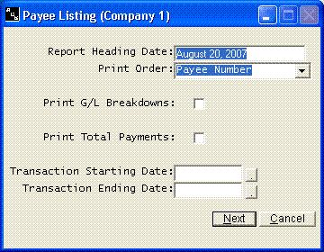 This listing is simply a list of all payee records that have been entered into the system. You can run the listing at any time. You will normally want a current listing to use in coding invoices. The listing can also serve as a payee directory, if you will enter the Phone Number in each payee record. The listing can be printed in numeric order by payee number or alphabetic order by vendor name. The date range is only used to limit the list to vendors who have had activity during a certain date range. Normally these dates would be left blank. | |
