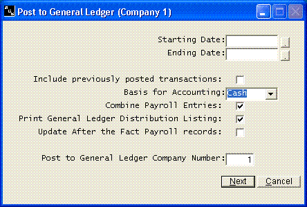 Enter the date range in MMDDYY format. You would normally enter the first day and the last day of the month, but you can post more often if desired. Include Previously Posted Entries A posting code will be placed in each transaction as it is posted to the General Ledger, so you can not inadvertently post a transaction twice, even if the transaction it is in the date range you choose. You can re-post any transactions by answering with a "1" to this question. Enter a blank or zero for normal posting. Print Distribution Listing We recommend you always print a Distribution Listing. This will be your record of everything that was posted during the run. Cash Basis or Accrual Basis You must decide if you want your books posted on a cash basis or an accrual basis. You must always be consistent in how you answer this question! Under a cash basis, the system will only post the expenses that were paid this month. Under an accrual basis, the system will post all invoices that were dated this month even if they have not been paid. If you do not know how your books are currently being posted, you will need to discuss this with your accountant. You cannot change back and forth between methods. If you have an accounts payable account in your General Ledger and the account has a balance, you are most likely on an accrual basis. Combine Payroll Entries Payroll checks will be written to the Checkbook system from payroll. You will get individual entries for each withholding account. As you can imagine, these entries can waste several pages of print in your General Ledger trial balance. If you want the payroll entries summarized by pay period, be sure to check the box. Update After The Fact Payroll Records The ACS General Ledger system has an option to maintain earnings records for employees. Payroll reports and W-2s can be printed from these files. Normally you would not be maintaining these files, but if you are, the system can update the earnings records for any payroll checks written during the month. General Ledger Company Number to be Posted to You can have up to 99999 different companies in the Checkbook system. Sometimes with multiple funds or for other reasons, you may have several checkbook companies setup that should all post to the same company in General Ledger. You have this option. The Company Number to which you are assigned will be automatically displayed, but you can post the Check Book system to any company. | |