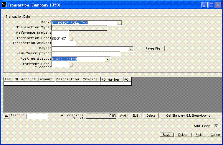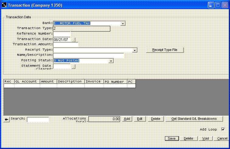 Note that you basically have two sets of buttons at the bottom of the screen. The set of buttons immediately below the general ledger breakdown information if used in adding and correcting the general ledger breakdown. The buttons along the bottom work with the entire screen. Note the Add Loop button. When the box is checked, the system will loop on the same screen allowing you to enter additional transactions or entries without having to go back and forward between each entry. On the last entry, you will have to disable the add loop to get back a screen. The Get Standard G/L Breakdown button is used to automatically pull the general ledger information once you select a receipt type. You do not have to enter a Receipt Type. Just skip over the field when enter transactions if it is not applicable to you. The Delete button immediately under the breakdown screen will allow you to delete a general ledger breakdown. Simply highlight the specific breakdown and click the delete button. The Delete button at the bottom of the screen will delete the entire entry. If you wish to leave the entry in the files (to account for a voided receipt #, etc., you would normally use the Void option instead of the delete option. Both options adjust the bank balance for the deleted or voided entry..