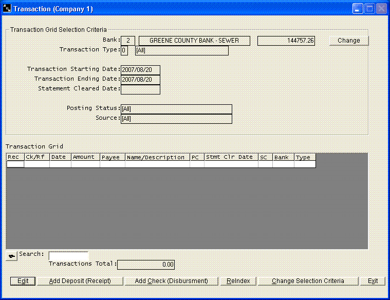 Every check, receipt, or miscellaneous transaction is stored in your checkbook transaction file. All print programs in the system, except the unpaid invoice listing, extract their information from this file. These transactions will be retained in this file until they are dumped using the remove transactions option from the Checkbook System Menu. Each check is placed in this file immediately after printing. You will record receipts and hand written checks directly into the transaction file. You can make corrections to your checkbook history anytime. If the transaction has been previously posted to the General Ledger, you will be given a warning that you will need to make an adjustment to the General Ledger. You can access this checkbook transaction file at any time. You can use this option to void checks or correct transactions. You can also use the option to review any transactions. Any corrections you make to this file will affect the bank balance, as well as all reports. As you access this file, you must first indicate the bank account in which you will be working. You must then indicate the type of transaction you will be accessing. If you wish to work from a different bank account or work with a different type of transaction, you must return to this sub-menu.