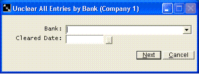 This Unclear option will allow you to remove the cleared date from a series of transactions in the Transaction History file. Normally you would never use this option, but if you use the wrong clear date as you reconcile the bank, you may wish to remove the cleared date and start over. You can go into the bank reconciliation option and click on every entry to unclear each entry, or you can run this option and unclear the entries all at once. Be sure to select the correct bank account. The cleared date in the transactions must match the date entered above.
