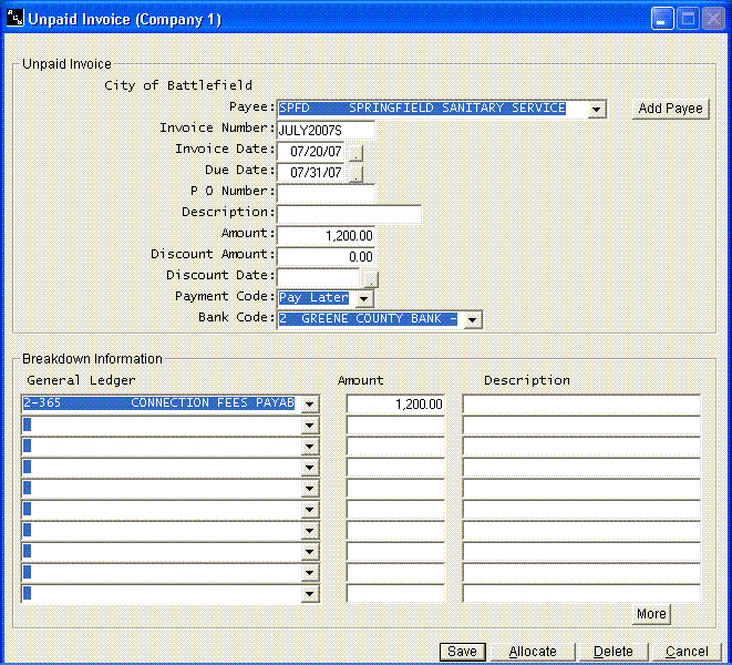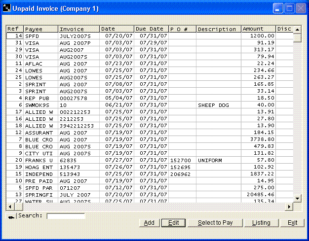 The system will allow you to enter invoices as they are received and then choose to pay them a a later time. All of the unpaid invoices will be displayed when you first take this option. To add new invoices, click Add. To edit an existing invoice, highlight the invoice record and click edit or press Enter. You can also double click.