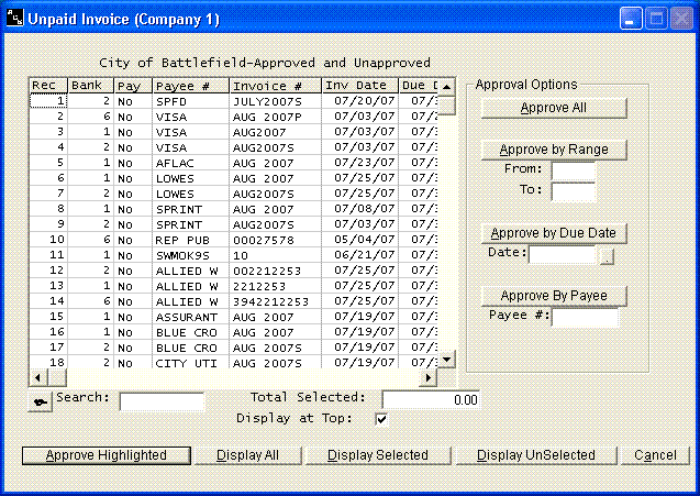 Payee Number You will be selecting the payee number from a list of previously entered payees, but by clicking on Add Payee, you can enter new payees as you record invoices. Invoice Number You must enter a unique invoice number on every invoice. The invoice number is used by the system in identifying information in other files. If the invoice does not have an actual number, use a date or something that will be unique. You can use the same number on different vendors, just not the same vendor. One example of why invoice numbers must be unique is that the system will notify you if an invoice has already paid. Invoice Date The invoice date is mandatory. It will be shown on the various reports produced by the system and it will be used in determining your accounts payable balance at month end. Due Date The system will allow you to select your invoices for payment by the due date. If you are using the system as an accounts payable system and wish for the computer to locate and pay all invoices due by a certain date, you must enter the correct invoice due date. The due date also appears on the listing of unpaid invoices. If you use this listing to determine which invoices need to be paid, you may also need to enter the correct invoice due date. It is mandatory that a valid date be entered, but if you do not need the information mentioned above, you can simply skip the due date. Purchase Order Number The system allows you to enter the purchase order number, if one is applicable. The system does not need this information. The purchase order number will be shown on your unpaid invoice listing. If you use purchase orders, this will allow you to easily trace the invoice back to the purchase order. It will also help you to make sure that no invoices are being paid without a purchase order. Invoice Description The invoice description will be printed on various reports within the system, such as the Listing of Unpaid Invoices. It is not necessary to enter the description if you are coding your invoices for immediate payment. The description can be carried to the General Ledger system. Amount The amount field should contain the total amount of the invoice, or the amount you want paid. If you are entering credit memos, be sure to enter the amount as a negative figure. Payment Code The Payment Code is used to code the invoice for immediate payment. Choose Pay Now for immediate payment. If you are using the system as an accounts payable system, you can answer Pay Later and then code the invoice for payment at a later time.. Bank Code If an invoice is coded for immediate payment, you must tell the system which bank account to use. The system will default to the bank account to which you are currently assigned. General Ledger Number You must enter a valid General Ledger Number. If the General Ledger Number is not in your chart of accounts, you must add the account before you can process this invoice. If this a constant problem or if you do not know the General Ledger Number, we recommend you set up an account called "unclassified" and use that General Ledger Number instead of guessing. This will force your accountant to reclassify these entries. An invoice can be broken down to any number of General Ledger accounts. These numbers and the descriptions can be pulled from your payee files simply by clicking the Allocate button once the vendor number has been entered.. We recommend you place these General Ledger Numbers in any payee record that consistantly uses the same general ledger numbers. Refer to the Payee instructions for more details. If you have more general breakdowns than will fit on one screen, click the More button and you can get additional screens. Select To Pay You can select the invoices to be paid by clicking on the Select Invoices button at the bottom of the first screen. You have many options for selecting the invoices to be paid. Once invoices have been coded for payment, you should choose the Print Checks option from the main check book menu to print the checks. Once in the Check Print option,you should choose to Print from Selected Invoices on the first question. Select Specific Invoices to Pay To select specific invoices to print, you can highlight any invoice and press Enter or click on the Approve Highlighted button at the bottom of the screen. Approve All If you choose Select All, all unpaid invoices in the file will be coded for payment. Approve by Range This option allows you to select a group of invoices by entering the first and last reference number of the invoices to be paid. The reference number that is being referred to is the numbers in the left hand most column. Approve by Due Date The date is based on the invoice due date. Enter the latest due date to be selected and then click on the Approve by Due Date button. Approve by Vendor You can select to pay all invoices on a certain vendor by entering the vendor number and then clicking on the Approve by Vendor button Other Button Options The Display Selected button and Display Un-selected buttons can be used to easily see what has been selected or not selected. The Display at Top button always positions the last invoice selected at the top of the screen. This makes it much easier to immediately see where on the list of invoices and find the next one to be printed.. The Listing button on the first screen will allow you to print a listing of all unpaid invoices. You can always print any of the listings you see on the screen by clicking on the character to the left of the search option. The is always a Print option available. Once you are finished, take the Cancel button. If you are ready to print checks, take Print Checks option from the main Checkbook menu. Once there, take the selection to Print from Selected Invoices. | |