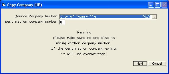 The Copy Company option allows you to create a new company identical to an existing company. This is very useful if you want to do some testing without affecting your real data. When you copy a company, be careful to assign yourself to the new company immediately and change the company name to another name, for example, call it "Test". You can change to the new company by taking the Select Company Number option from the system menu. At the point you copy the company, both companies are identical and it is very easy to be assigned to the wrong company when you are processing for real. As noted on the screen, if you have a network, no other terminals can be in either company when you copy a company. Also note, if the other company already exists, any testing or changes you have made will be covered up as the files are copied. | |