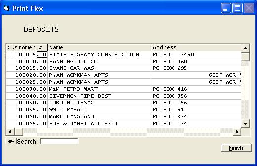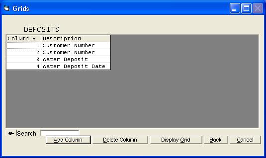 The Grids option (found under Files on the main menu) will allow you to design your own grids and populate the grids with any information from your main data files. These grids can be created at any time. Any time you create a grid, you will name the grid, save the grid design and then display the grid any time you choose. The examples shown in these help screens are from the ACS Utility Billing System. The folder names and data will be different depending on the system you are running, but the basics of how to create and use grids will be the same on all applications. As you review these instructions, go to the Grid option on the application you are running to see the data names, etc that are applicable to that application . In utility billing, for example, you will have two different data files to pick from. The customer file contains all of the customer information. The transaction file contains all of the transactions on all customers. These data names will vary depending on the application you are running. Once you have selected your data file, you will be shown a list of grids that have already been created. Select the grid you wish to access and press Enter or click Next. Back will allow you to select a different data base. The Add Grid option will allow you to set up a new grid. Normally you would want to keep the grids you have created, but if you need to remove a grid, highlight that grid name and use the Delete Grid option to remove the highlighted grid. Once you select an existing grid, you can see the columns that are contained in the grid. At this point you would normally be ready to display the grid. Click on Display Grid to see the completed grid. You do have options at this point of add additional columns to the grid or delete any columns from the grid. The grids have many features. The search option allows you to search for any piece of information that is displayed on the grid. For example, if you want to know who gets their mail at box 91, you could simply enter Box 91. The search information does not have to contain the entire contents of a column. It can be as little as 2 or 3 characters. Click on the symbol to the left of search field. The auto-filter option will show drop down arrows at the top of each column. You can choose one of the items in the drop down list and the grid will be limited to just that criteria. You also have options to Print the grid or maybe send it to a spread sheet program or a text file. If you choose to add a new grid, you will first be asked the grid name. You can not use spaces within your grid name. Just use a name that you can easily identify, but one that is descriptive enough for someone else to also identify. Once you enter the grid name, you will be given a list of all data that is contained in the data file to which you are assigned. The column number will be assigned automatically in the order you select the information you want displayed. You can change columns and insert columns by changing the column number. To select the information you want displayed, use the drop down arrow and highlight your selection. Press Enter or click Add Column to add the column to your grid. The information contained in your data base file will be displayed in alphabetic sequence. Click Finish when all columns have been added. Your new grid will be added to the list of grid names and you can then test your new grid. | |
