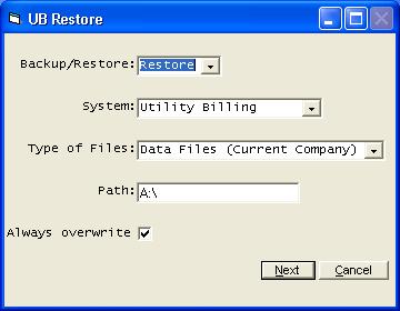 The Restore option will allow you to restore files from a backup. The restore options are similar to the backup options. The first question will default to restore. You must pick the system you are restoring. You have an option to restore either data files or programs. The data files are your records that change daily. These are files you should backup daily. This will be the normal choice when restoring files. The programs never change unless you receive updates from ACS. Programs would normally never be restored unless your computer should crash, etc. You must know the exact path where the files were backed up. If the files were backed up to diskette, the path will simply be A:\. If you backup to some other device, you must know the full path name including drive name and folder name. If the files successfully restore, you will see the file names quickly displayed on your screen. If the files already exist in the restore path, you can mark the check box to indicate you want the files restored without giving any warnings. | |