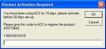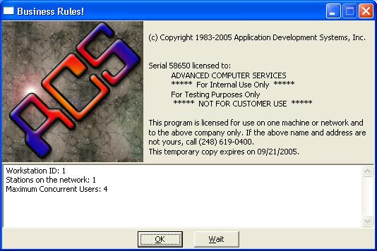 ACS uses another product called Business Rules! This license agreement will be displayed any time you launch the ACS software. Click OK to prevent the license agreement from staying on the screen for an extended period of time. | |