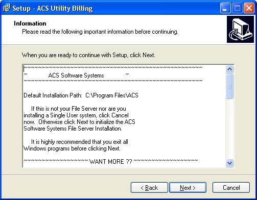 If this a single installation or if you are installing to the file server, click next to continue. If you are on a network and this is not the file server, you should not continue. This cd is not intended to be used as an installation tool for terminals.If you have a multi-user system, you will also recieve a Workstation Setup cd. You must insert the Workstation cd into each terminal and follow the installation instructions before each workstation can access the ACS programs.