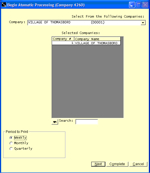 The system will allow you to automatically process several different reports in order without operator intervention. This Automatic Processing option will simply start the Automatic Processing and the preselected reports will be printed. Please note that you should not run this option without having first selected the programs to be run in Select Automatic Processing Programs from the Automatic Processing option on the main menu. See the section of this manual titled Select Automatic Processing Programs for more information. This option will allow you to begin the Automatic Processing routine. Be sure the order of Automatic Processing is correct before you take this option. If you need to change the order of processing or change the programs to be processed, or simply wish to review the programs which will be processed, take Select Automatic Processing Programs from the Startup Options menu before you take this option to start the print process. Before the printing begins you will be asked which companies you wish to process in which order. First select the companies you want to process. As you select each company, mark the period you are processing so the system will know which reports to print. Once all companies have been selected, take complete. Most programs will take the default answers to all questions and should not stop for operator intervention. There are exceptions, so you might want to place those menu options first in your processing to allow you to answer those questions and then let the process continue on its own.