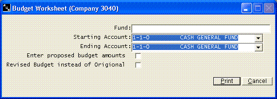 If you select the budget worksheet, you can select the specific range of accounts that you want printed. For example, if you are a municipality and you want a worksheet on the Water Fund Expenditures, you can select that range of accounts. You can run the worksheet as many times as necessary to print all funds. You can use Enter Budget Amounts to enter the new budget amounts once they have been determined. Also, ACS offers a Budget Maintenance program that works directly with the ACS General Ledger system. The Budget Maintenance program contains features that will automatically update the budget information in your general ledger. | |