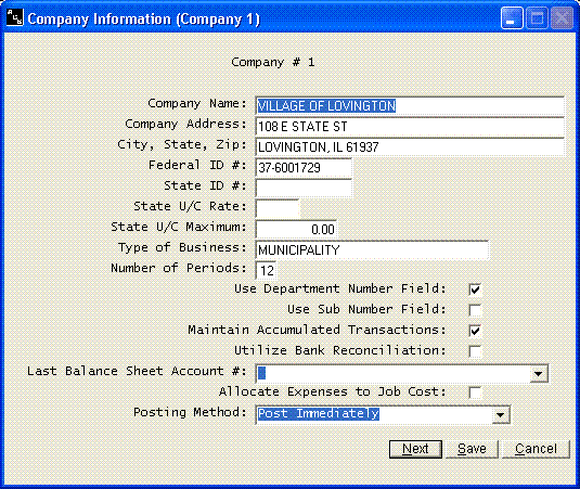 The Company Information option can be found under Files on the main menu. Ti will allow you to assign or change the company name and other vital information in the Company Information File. This file contains information about the company which is essential to operation of the General Ledger system. Be sure to run this program before you attempt to do any processing. You will need to run this program on each company that you install on the system. This program also serves as a file maintenance program if the company information should change on any company.