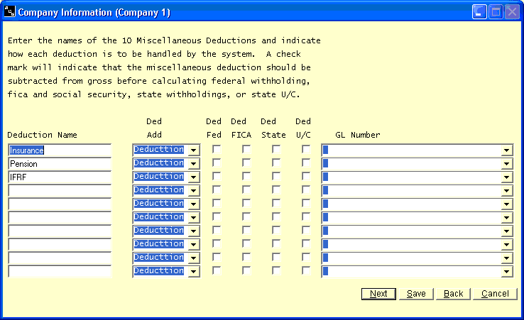 If you are utilizing the After the Fact Payroll features of this system, you will need to supply the above information. If the company has any deductions other the standard Fica, Federal, and State, you need to give them a name and indicate if is a deduction or an addition to net. If it is pension type deduction, you will need to indicate how it effects Federal, FICA, State, and Unemployment taxes. If should be subtracted from Federal and State, for example, you would check the Federal and State boxes. For a cafeteria type plan, you would most likely check all 4 boxes. Unemployment could be questionable. Also indicate the withholding account that will be applicable.