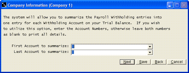 All other ACS applications, such as payroll, contain menu options that will allow those systems to post directly to the General Ledger. The above option will allow the entries to be posted immediately to General Ledger or to be retained in holding files in the General Ledger until you choose to post them. If you wish to hold these entries and review them before they are posted, choose to Place in Holding Files. . You can review these holding files and post the entries using the Post from Holding File option on the main menu. Normally you would choose to Post Immediately. If you do not want to see all of the detail transactions for the withholding accounts listed on your trial balance, you can indicate the range of general ledger numbers for your payroll withholding accounts. If you summarize these, you will see one entry for each pay period.