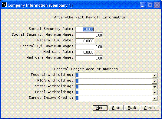 If you are using the After the Fact Payroll features of the system, you will need to enter this information. It will be used in producing the payroll reports and post the entries to the general ledger.