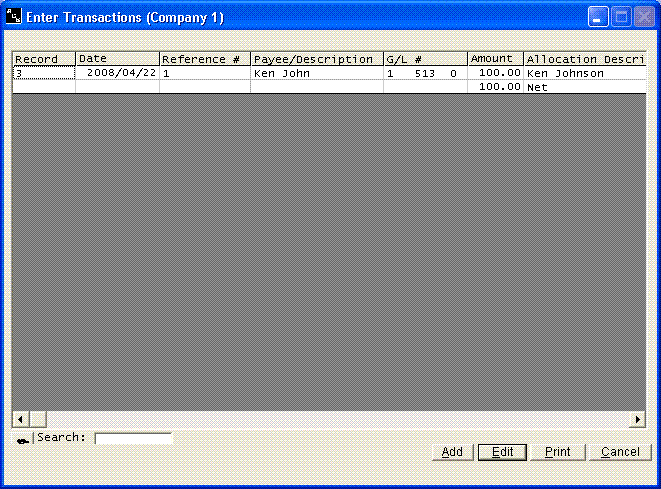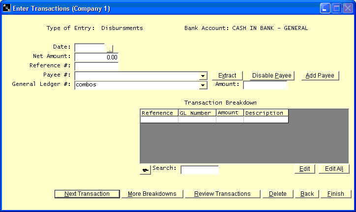 The following information is requested on each disbursement. Date The date should be entered in the format MMDDYY. The date will be retained from screen to screen, and it will only be necessary to re-key the date as it changes. Net Amount Enter the net amount of the transaction. Remember that even though the system uses the minus sign to distinguish credits, you will only need to use negative figures on the adjustments. The system will automatically reverse the sign in this program based on the type of transaction you are entering. You can enter the amount as 0 and the Payee/Description as VOID to record a voided transaction. Reference Number The reference number can be 12 characters long. If you use only numeric characters, the system will automatically increment your reference number after each transaction. The system uses the reference number to tie multiple entries back to the same transaction. You must use a unique reference number on each transaction. Of course, you will use the same reference number on a transaction with multiple breakdowns. Payee Number If you process several entries to the same payee, we highly recommend you set up a Payee Record for that vendor. That record will contain the payee name, the standard general ledger numbers where the purchase is normally classified. When assigning payee numbers, we recommend you just use the first few characters of the name. This will allow you to easily find the record without having to search for it. Once a payee record has been established, all you have to do is enter the payee number, press the Extract button or Press ALT X and the system will extract the payee description, the general ledger numbers, and breakdown descriptions for you. If the breakdowns are correct, all you have to do is press enter and start the next transaction. The system will automatically update the vendor record for each purchase. 1099 information will be available.. If you have an entry that needs to be classified to more than one account, enter the amount of the first allocation under the Amount field. Click the More Breakdowns option to add additional breakdowns. On entries with only one allocation, it is not necessary to enter an amount in the Amount field. The system will assume the same amount as the Net Amount you entered earlier and save you from entering the same amount twice. Payee/Description If you are not using the Payee features of the system, you can disable the Payee features and enter the Payee Name or Description. General Ledger Number Enter the general ledger number to which this portion of the transactions should be allocated. Amount The Amount field is only used when you have multiple breakdowns on a transaction. This amount field is the allocated amount amount that should be classified to the general ledger number you have just entered. With only one allocation, it is not necessary to answer the amount field.. Description of Buttons Extract The extract button is used to pull information from a payee record. Once the payee number as been entered, you can click the Extract button or Press Alt X and the system will access the payee record and extract the information for the remainder of your entry. Disable Payee If you do not with to use the payee features of the system, you can disable it by clicking the disable button. To enable it, just click it again. Add Payee You can add payees as you enter transactions. Simply click the add payee button and enter the vital payee information. You will be returned to the transaction entry screen. Next Transaction When you are completed with a transaction, press the Next Transaction button. Please note that any button that is highlighted is the default button when Enter is pressed. Actually when you are through with a transaction, you can press Enter and never have to reach for the mouse. More Breakdowns If a transaction is being allocated to more than one general ledger account, click on More Breakdowns instead of Next Transaction to allow for an additional breakdown. Review Transactions The Review Transactions option will allow you to review the transactions you have just entered. You can review and make corrections at any time. See more details later. Delete The Delete option will allow you to delete the transaction that is displayed on the screen at the time. Back The Back button will allow you to return to the first screen. This will allow you to change bank accounts or transaction types. Finish The Finish button will allow you to move to a proof total screen when completed. At that point you can check the proof totals and make a decision to make corrections or to post the transactions to the general ledger. Corrections Screen When you take review transactions, you will get a list of all transactions entered during this batch. You can highlight any transaction and click Edit to make any changes. You can Print the listing by clicking Print. If you want to Add more transactions, click Add. The Search option at the bottom of the screen will allow you to search for any piece of information in the list of transactions. Each contra account (bank account) that you used will be listed on the proof total screen. The total of all transactions processed against the account will be shown, along with the beginning and ending balances. You should be able to compare the ending balances to your bank reconciliation and check the accuracy of your input. You will also receive a total of the debits and credits processed. The debits and credits should agree, unless you have intentionally processed "One Sided" adjustments to get your books back in balance. If the proof totals are correct you can continue on to the posting process. If you have errors or simply want an edit list of your input, you can indicate that corrections need to be made.