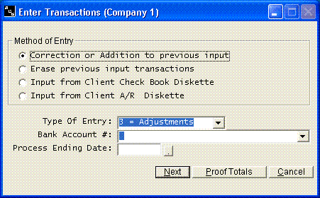 The Enter Transactions program is used to enter transactions such as disbursements and receipts. You must build your General Ledger master file before you can enter any transactions. This program can be run as many times as may be required during the month. If the company you are working with only has a small volume of transactions, you will probably find it more efficient to process all transactions at one time at month end. If the volume of transactions is very large, you may find it convenient to enter transactions as often as once a week. Method of entry As you enter your transactions, your entries are stored in a temporary work file. Each time when you finish entering transactions into the system you will receive proof totals, such as the total debits and credits entered. Often you may make errors in input which are not easily identified, or you may find that you need additional information before you can continue. If there are un-posted entries in the work file, the first option above will allow you to return without losing your original entries You should the option to erase previous entries if you wish to loose them and start a new batch.. It is not intended that you use this corrections option throughout the month to allow the entry of all transactions before you post your entries. If other systems, such as the payroll system, are integrated into this system, those systems will clear this work file each time they post transactions to the General Ledger. This will lose your input. Another potential problem is that sooner or later you will forget to take the right option and destroy your previous input before it is ever posted. Type of Entry You have options for disbursements, receipts, adjustments, payroll checks, sales, or purchases. This input program has been designed so you are only required to enter one side of all entries, except adjustments. The system automatically accumulates the other side of your entry. For example, if you are entering disbursements on a particular bank account, you will only enter the debits to the various expense accounts. The system will accumulate the credit to cash in bank and automatically generate the entry during the posting process. Bank Account Enter the bank account number of the bank to which the transactions should be debited or credited. If you are recording sales or purchases, enter the receivable or payable account number. Process Ending Date The date requested above will be used on the summary bank entries. It will normally be the last day of the month.