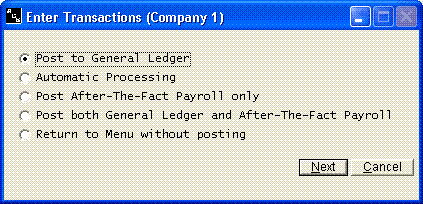 Once your proof totals are correct and you have indicated you are ready to continue, you will be given these options. The instructions for automatic processing are found in another section of the manual.. If you select automatic processing, the computer can handle processing for you. If you cannot get the proof totals corrected or if you need more information before you are ready to post the transactions, you can select to return to the system menu without posting. You can re-select the input process at a later time and indicate on the first screen that you are making corrections. This will allow you to return to this program without losing your input. The last option will immediately post your entries to the General Ledger accounts. Please note that your input is only contained in a temporary work file. You must choose to post the transactions to the General Ledger in order to have General Ledger updated for the new transactions. You can either include the posting routine as part of automatic processing, take option 2 above to post the General Ledger immediately, or return to the menu and post the entries using Post General Ledger from the Current Period Processing Menu. If you fail to have the system post your entries, these entries will never be reflected in your General Ledger account balances. | |