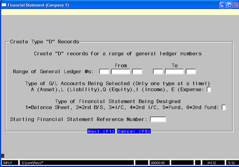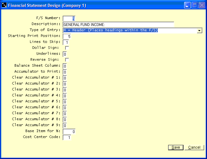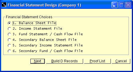 You will receive a warning that this initial file preparation program will clean the file which you have selected. The name of the file will be printed on this screen. If you selected this program in error or if you only need to add more records to the file, you can return to the menu without destroying the file. Add New Records The second option on the Financial Statement Format Menu will allow you to add new items to any existing financial statement. These files contain the information that will control the data that will print on the different financial statements. You must always indicate which statement you wish to access. The reference number field can contain five characters. The description is limited to 50 characters. The type of entry must contain one of the following characters. R = Report Heading S = Secondary Heading (department Name, etc.) F = Footnote H = Header Record (Example: Assets) D = Detail Line T = Total Line (Accumulated Detail Lines) P = Mandatory And Only Valid on Balance Sheets and Fund Statements. This Record Should Have a Description Field Similar to "Profit/Loss-YTD" or "Net Income". E = Combined equity and CURRENT Years Profit B = Bank Account on a cash flow Statement C = Cash flow record when Operator Input is Required The "Starting Print Position" and "Lines to Skip After Print" can contain two numeric characters. The following fields must contain either a 0 or a 1 (0 = No, l = Yes) $ SIGN PRINTED REVERSE SIGN CLEAR ACCUMULATOR (1-9) BASE ITEM FOR INC. STMT. % The "Underline" field must contain a 0, 1, or 2, which will determine how many underlines are to be printed. The "Balance Sheet Column" must contain a 1, 2, or 3, if you are working with one of the two balance sheet files. The "Number of Accumulator to Print" field must contain a 0 through 9, depending on the accumulator that you want to print. Enter 0 if no accumulator should print. The "Cost Center Code" can contain up to three numeric characters. You can review the beginning of GL Master File for a more detail description of the items contained in each format record Print Proof List The Proof List option is at the bottom of the first screen. This listing will show all of the information that is contained in any of the financial statement format files. It can be run anytime. The proof list will normally be used in proofing your original input, but you may find it very helpful to always keep a current proof list in the company file. This will be of great assistance if you need to add or delete lines from the financial statements. It will also be helpful when you are assigning financial statement reference numbers to any new general ledger accounts. Create "D" Records There is on option on the first screen that will allow you to build about 95% of the financial statement without having to enter the information yourself. This routine cannot build the Heading or Total Records, but it can build all of the D records. For example, if you were designing an income statement, the first few lines of the design would be the R record, maybe the S record, and one or two H records. The would come a series of D records for the income accounts. We suggest you increment your financial statement reference number by 10. If this was done, your next available reference number would be about 60. To create the first set of D records, you would give it the first and last general ledger number of the revenue accounts. You would the indicate that they are revenue accounts. You would tell it you are designing the primary income statement and tell it to start with reference #60. You would proceed in this manner. After the revenue accounts you will have some more "T" (total) and H (heading) records. Maybe taking up 2 or three reference numbers. Look at the grid and see what the last reference # it assigned to the revenue accounts. Add about 30 to that number and start creating the D records for the expense accounts. When finished creating the D records, you can come back and insert the header and total records.