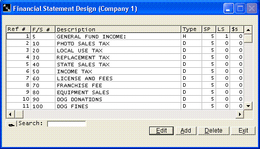 Building and Maintaining Financial Statement File This system has been designed to give you the flexibility of designing your own financial statement format. This section will give details as to how to build these files. The Balance Sheet, the Income Statement and the Funds Statement/Cash Flow Statement are all produced from these financial statement files. You can have two different formats for each of these statements, so you can actually have six different format files if you are using all of the features available. Following is a list of the file as they will be referred to in the programs. Please note that you can use the Fund Statement/Cash Flow Statement as a fund statement or a cash flow statement, but not both. For example, if you need a cash flow statement, you will design such a statement and then select the appropriate print routines from the Print Financial Statement menu. If you need both statements from the system you can design the primary statement as one type of statement and the secondary statement as the other type. When installing the system, you must understand the concept upon which the system is based. There is one major file in the system that holds all of the General Ledger accounts for each company. There are six other files that hold the financial statement formats shown above. Each General Ledger account contains six slots to hold the reference numbers as to where that General Ledger account will appear on each of the six statements. Once you select the statement you wish to work with, you will get a grid of the entire file. You can make corrections by double clicking on any item or by highlighting the item and clicking Edit. Each of the six format files is designed the same way and contains the same type of information. Following is a list of each piece of information that will be contained in each format record. Reference Number In order to access and identify the format records, each record must have a reference number. The reference number must be all numeric and can not exceed four digits. It is suggested that you assign your numbers in increments of ten and begin with number ten. This will give you room to expand the files for any item you may wish to add later. Description You will enter the description exactly as you wish for it to be printed on your statements. It is limited to 50 characters, but you should attempt to keep the description as short as possible. If there is not enough room to print the full description on the statement, the system will automatically shorten the description. It is impossible to give you the exact size to use, since the size of the print field will vary with the starting positions you enter and the columns you choose for printing. Type of Entry Each record that you place in the format file must contain the type of entry. Only the types listed below are acceptable codes. You must be aware that you will control everything that is printed on your statements, except the company name and the date. R = Report Heading - You have the ability to enter your own report heading. If you do not enter a report heading, the system will use the standard name of Balance Sheet, Statement of Income and Expenses, and Statement of Changes in Financial position or Cash Flow Statement. The record for the report heading should be the first record you enter so that the heading is known when the statements first begin to print. If either the report heading or secondary heading needs to be changed during the running of the report, the new R and S records must be assigned before you indicate to the system to space to a new page. If this is not done, the page heading routine will still print the old page heading on the first page of the new section of the report. S = Secondary Heading - The secondary heading is not required, but it will allow you to place department names, etc. in the heading. A sample heading might look similar to the following: Advanced Computer Service, Inc. (Pulled from file) Statement of Income and Expenses (Code R) Sales Department (Code S) For the *seven month period ended* July 31, 1995 * (Pulled from period ending date file) F = Footnote - The system will allow you to print a message two lines from the bottom of each page of your statement. Normally the message would read "See Accountant's Compilation Report", but you can enter any message you choose. The description on each format record can only be 50 characters long, so the system has been designed to allow you to enter two footnote records in order to expand your message to one full line. If you do enter two footnote records, you must tell the starting position of the first record and the second record will then be automatically continued on. The footnote records should also be entered close to the front of your format files so that the system will know the footnote information before it spaces to the first new page. H = Header Record - The header records are any descriptions that are to be printed, but contain no amounts. The wording "ASSETS" across the top of your balance sheet or the wording "Current ASSETS" at the beginning of your asset section are examples of header records. D = Detail Record - The detail records are the records used to accumulate the information from the General Ledger master file. These will show amounts when printed. "Cash in Bank" would be an example of a detail record. If you had several cash accounts in your General Ledger you would probably assign them all to be printed under the detail record called "Cash in Bank". You can have as many detail records as you wish to have printed on your financial statements. T = Total Record - Total records are any format records that will print totals of the detail records. "Total Current Assets" or "Total Assets" would be examples of total records. P = Profit and Loss Record - The profit and loss record is a mandatory record for the "Fund Statement" format, and possibly a mandatory record for the "Balance 