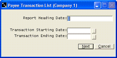The Payee Transaction List option will allow you to print a detailed listing of any payee's transactions. | |