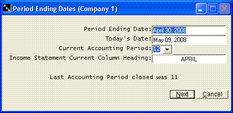 All programs in the system have been written to obtain the process period ending date and the current date from a special date file. You will be required to enter these dates each time you change from one period to the next. The dates are tied to a specific company. The process period ending date and today's dates are expected to be spelled out in character format. The number of the Accounting Period is very critical. The system stores each months (could be any time period) history in the general ledger file. It is critical that you close each month and it is critical that this Accounting Period be entered correctly and changed each month. You will also be instructed to enter the heading for the current column on the income statement. This will allow you to process for different periods of time, such as monthly or quarterly. Be sure to use all capital letters on the heading in order to match the other headings on the statements. If you use "Current" or "Current Month", you will not be required to change the wording each month. The "Last Accounting Period Closed" will always be displayed on the screen. As you start a new accounting period, you can easily determine if the prior period was closed. | |