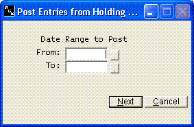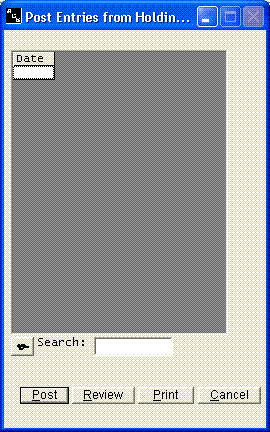 You will be asked the date range to post. Normally you will post the entire month at one time. Always be sure that the previous month has been closed before you start posting a new month. Use MMDDYY format for the date range. You will receive a list of all holding files in the date range. Normally you will want to post every file in the date range, but if you are uncertain about a file, or you know a change needs to be made, you can click Review to access any holding files.