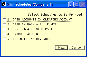 This program is used to print any or all of the schedules that are set up in the schedule File. This program can be run anytime. It is listed on the Print Financial Statement menu. If you select the program in automatic processing, all schedules will be printed and you will not receive any prompting messages.