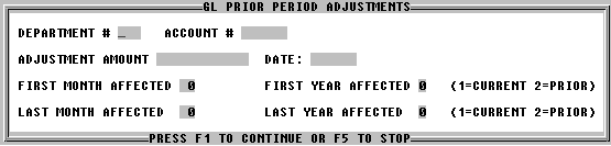 This program will allow you to enter prior period adjustments such as year-end adjusting entries even though you have processed several months into the current year. These adjustments will affect the balance of any accounts entered, but will have no effect on your current month activity. Enter Prior Period Adjustments, found on the Miscellaneous Options Menu can be run at any time. Enter the account number of the account to be adjusted. The adjustment amount will be applied beginning with the month you enter as the "First Month Affected" by the adjustment. All months between the first month affected and the "Last Month Affected" will be adjusted by this amount. If your adjustment is a credit, be very careful to enter the amount as a negative figure. Please note that you must also enter the first and last year affected by the adjustments. Your adjustments can go back one year. You will receive a report of each adjustment entered. These adjustments will not appear on your current trial balance or transaction journals. They will be stored in history. | |