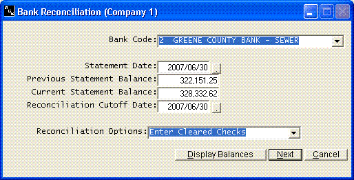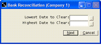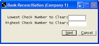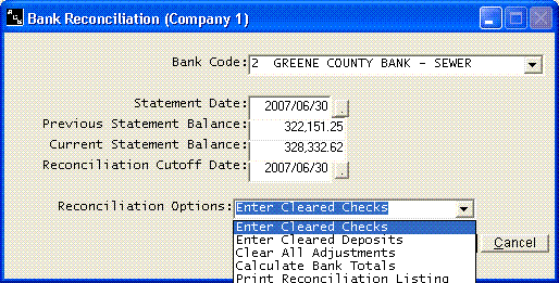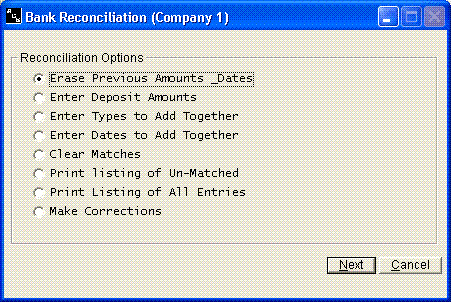 The Reconcile Bank option from the Bank Reconciliation option under Files on the main menu will allow you to reconcile your bank. The bank reconciliation feature works from your bank reconciliation file, so make sure all transactions for the month have been recorded. This file is automatically updated as transactions are posted to the general ledger system. The only thing you need to do in order for the system to print your reconciliation is to code the checks and deposits that have cleared the bank. This is the first step you must perform.