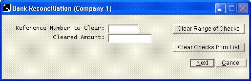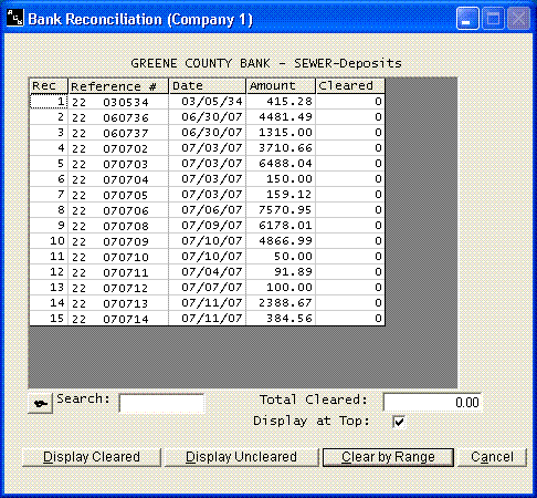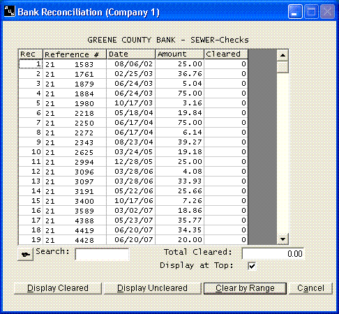 You have multiple options for clearing the checks. If your bank statement lists the cleared checks in numeric order and marks any skipped numbers with an *, etc., it is very easy to clear the checks using the Clear Range of Checks. Clear Range of Checks Clear From List The Clear From List option will display a list and allow you to check the ones that have cleared You also have the option to select individual checks to clear. To clear a check, simply click on the check to be cleared. To unclear a check, click on the check a second time. You should be a running total of the checks cleared. It should agree with total checks cleared on the bank statement. You can click on Display Cleared to see just the cleared checks. You can click on Display Un-cleared to view the remaining un-cleared checks. If you choose to Clear By Range, it simply returns you to the options shown on the previous screen. The Display at Top option always keeps the last cleared check at the top of the grid. It is much easier to find a check when you don't have to scroll up and down to look for it. Once all checks have