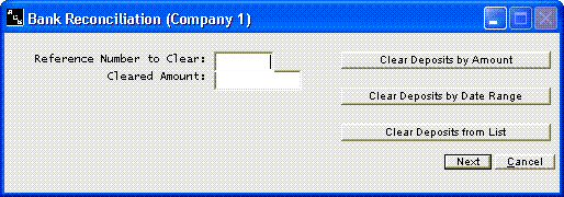 Enter Cleared DepositsOption 2 will allow you to enter cleared deposits. You must enter all cleared deposits before you can print your bank reconciliation.