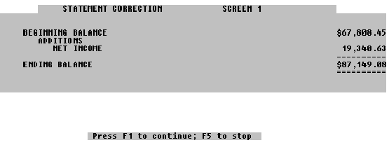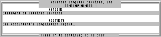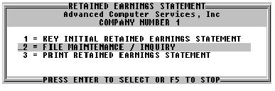This program will allow you to prepare, change or print a statement of retained earnings in a format that is designed by you. You must enter all of the figures and detail lines that are to print on the report before this report can be printed. If the figures are not changed each month before the report is printed, the report will be identical to the previous month. This report can be run anytime. It can be found on the Print Financial Statement menu. If this program is executed as part of the automatic processing procedure, all messages will be bypassed. Option 1 will erase all information currently in the file. Generally this selection will only be used the first time you run this program on any company. You have the ability to enter your own report name and also a footnote to appear at the bottom of your statement. The report name should be entered on the first line. It can be 80 characters long. It will automatically be centered on the page between the company name and the date. The name and date will be pulled from other files in the system. The footnote can be 80 characters long. It will be centered two lines from the bottom of the page. You can enter a blank if you do not have a footnote. You can have ten blank lines on the first screen to begin entering your statements. This screen allows you to enter all information that you want printed on the report. If you have too much information to enter on one screen, you can use as many screens as may be necessary. You simply press F1 to continue to the next screen. Remember that you are responsible for all detail information that is printed on this report including blank lines, indention’s, dollar signs, underlines, amounts, etc. The only information that is printed automatic is the company name, the report heading (which you assign), the date, and the footnote (which you assign). The first screen will begin printing immediately below the date, so you may wish to skip several blank lines at the beginning of your first screen. The reason that no information is pulled from the General Ledger automatically is that this statement is never consistent from company to company or from year to year. You may have prior period adjustments, which would not be stored in the General Ledger, or the company could be a partnership with varied ways of allocating profits, etc. The system is totally flexible in that this statement can be formatted to fit your changing needs, but you must remember to change the statement each month before it is selected for print. You can use as many 10 line screens as necessary. 2. File Maintenance / Inquiry If option 2 is selected, you will first be allowed to correct the heading and/or footnote. You will then be allowed to correct any of the screens that make up your statement. The cursor can be positioned anywhere on the screen and you can change any information. Press F1 after all corrections have been made. 3. Print Retained Earnings Statement Option 3 on this sub-menu will allow you to print the actual statement. If this program is part of the automatic processing routine you should do all required file maintenance before you select automatic processing. Automatic processing will not stop and allow you to make any changes to this statement. | |