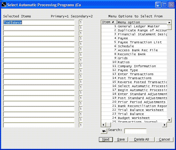 This system will automatically process several different reports in order without operator intervention. With this routine you can preselect all of the reports that you want printed on one or more companies. You can then simply start the automatic processing at anytime and the preselected reports will be printed. You can select up to twenty different reports in your automatic processing. You will first click on the menu option you want printed. You may also have to indicate if the report is a primary or secondary format. You should be careful not to place anything in Automatic Processing that requires operator intervention, such as a maintenance program. Once you have selected the reports that are to be printed, you can take Begin Automatic Processing from the Automatic Processing option on the main menu. There you will be given the opportunity to select up to 20 companies to process automatically. For more information, see the section of this manual entitled Begin Automatic Processing. | |