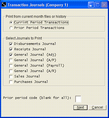 This screen is used to select the journals that you want printed. Check any journal that should be printed. If you do choose to print from a prior period, you must indicate which period to print. | |