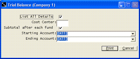 In the account coding structure you have the ability to enter a cost center. If you are using this feature you have the ability to get a trial balance on just one cost center. If you indicated the cost center was not applicable to you, or if you are using automatic processing, the above question will not be asked and all accounts will be printed. | |
