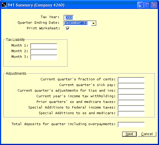The tax year is your current year. The quarter ending date will be the last day of each quarter. You must select from the list that will be displayed. The worksheet described earlier is optional, but we suggest you get this report as proof of the information that is contained on the 941. You must enter your tax liability by month. This should agree with the tax deposits you made each month. Refer to your 941 instructions for completing the series of questions asked above. You must enter the total tax deposits for the quarter.