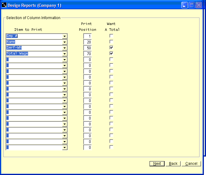 Item To Print Select the information that should be printed in each column. You can have a maximum of 20 columns on your report. Print Positions The use of the Print Positions will allow you to indicate where each piece of information (column) will be printed on your report. As stated earlier, you can have up to 20 columns on your reports. Each of the 20 columns must have a corresponding starting print position. These will be the beginning position of each column of information. Care must be taken to make sure that the fields will not overlap. If, after you have designed and run your report, you find that the printer skips a line within an employees record, you have overlapped some fields and it will be necessary for you to skip some more space between the starting positions of your columns. The space required for each item to print is shown later in this section. Total This Item This option allows you to total different numeric columns on your report. This field must either contain a 0 (do not total) or a 1 (total this column). Alphabetic columns cannot be totaled.