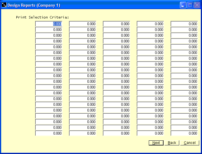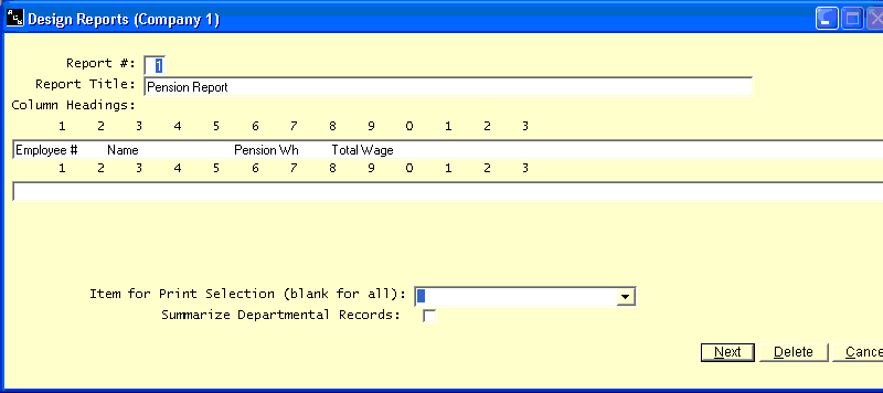 Any report formats that you design will be stored in the report file. The system will allow you to have up to 99 different report formats in this file. Report Number The Report Number must be a number between 1 and 99. Each report record must contain this number. The Report Number will be used in accessing the records and in selecting the reports to be printed. Report Title The Report Title will appear at the top of each printed page of your report. This field can contain 78 characters. Column Headings The system allows you to have two lines of Column Headings. Each line can be 132 characters long. The information that is entered in these two fields will also be printed at the top of each page. Your Column Headings will simply be your description of the information that will be printed on the report. Each print position will be shown on the screen. It will be your responsibility to properly position the information in your column headings so it corresponds with the information you have selected to print on the report. If you do not have layout sheets or a print ruler, you may have to temporarily enter the column heading, run a test report, and then reposition your headings. Item Number For Print Selection This field will be used in conjunction with the print selection criteria. This field will be the number of the item in the master or department record on which you want to base your selection of the records to be printed. A list of the items that you can use for print selection and their associated item numbers are listed later in this section. Only item numbers that contain numeric information can be used as criteria for selecting the employees who are to appear on the reports. Summarize Department Records This field allows you to specify whether you want to summarize all departmental records for each employee or to print the selected information for every department for each employee. This field must contain either a 0 (do not summarize) or a 1 (summarize). For example, if you have an employee who has two departmental records and both records have pension withholdings, you can either select to have both records appear on the pension report or you can select to summarize the records into one entry for the employee. Print Selection Criteria This field will be used in conjunction with the Item Number For Print Selection field. You can have a maximum of 100 items on each report as your selection criteria. The information that you enter in these fields will be compared to each master or departmental record in determining the employees who are to be printed on you report. For example, if you want to print a report that selects employees with specific vacation pay codes, you would enter a 16 in the Item Number For Print Selection field, which corresponds to Vacation Pay Code. You would enter the specific vacation codes that you want to use in selecting the employees that are to be printed. For example, if you wanted only the employees with vacation pay codes of 1,16, or 32 to print, you could enter these three items as your selection criteria and only the employees with one of these three codes will be printed The information that you use in selecting the employees for printing does not have to appear on your report. It is only used in the selection process.