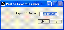 Please note that if you have the Checkbook system, your payroll checks will be recorded in the Checkbook History as the payroll checks are printed, and you should never use the Post to General Ledger option to post your payroll checks. The payroll checks will be automatically posted as the Check Book system is posted to general ledger at month end. You will need to run this program at the end of each payroll period if you do not have the Check Book system. You would normally enter the current payroll date, but you can actually post an old payroll date if necessary.
