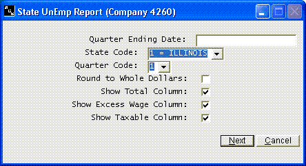This program prints a summary report that can be used in preparing your State Unemployment Report. This program should be run at the end of each quarter after all payroll checks have been processed. This report is intended to be an attachment to your regular state unemployment reporting forms. It shows each employee's name and social security number, along with their total wages and taxable wages for the quarter. This report will calculate the excess wages over the state unemployment maximum and the excess amount can be printed. This report is formatted to print on standard letter size paper. This report can be found under the Quarterly options on the main payroll menu The Quarter Ending Date is just the spelled out version of the last day of the quarter. You can process for multiple states. Just indicate which state code you wish to process. The id numbers, maximum wage, rates, etc are contained in the Company file. Be sure this information has been entered before processing this report. It is critical that you enter the correct quarter. The program groups the time by quarter based on the dates you enter as you calculate pay. If you are processing the last quarter of the year and have already changed your dates and processed a new payroll for the new year, you will have to temporarily change the beginning quarter dates by taking the Change Payroll Dates option from the Utilities option on the main payroll menu. Don't forget to change the dates back when finished. You have a choice to round to whole dollars. This is usually determined by the way dollars are shown on your state form. Just check the box to round to whole dollars. You have options as to which columns to display. Place a check mark in the appropriate boxes.