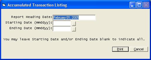 This system has the ability to hold all transactions on all customers for an extended period of time. This Accumulated Transaction Listing program will give you a listing of these transactions grouped together in Customer Number order. Since the listing could take many hours to print, it is not practical to run this program on a regular basis. You will probably only run this program at year-end. All transactions shown on this report will also be shown on a monthly basis on your regular transaction listing, therefore, you may find there is no real benefit of having this listing on file. Normally you would enter the beginning and ending dates of your accounting year. | |