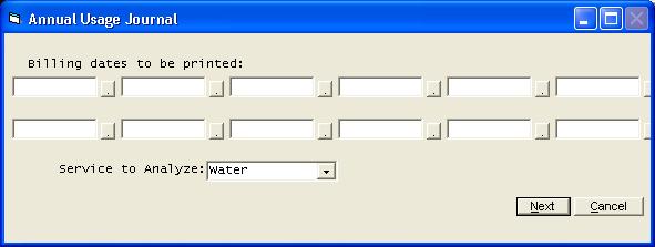 The Annual Usage Report will show the usage for any twelve month period of time. It will show all customers who were billed any time during the twelve-month period and it will show a separate column for each month. The report can be run any time during the year and you can select the months you want printed. This report runs from the transaction history file, so the report can be printed for any time period, but will be limited to those transactions that you have allowed to accumulate in history. This report differs from the monthly Usage Report in that this report only shows usage. The monthly Usage Report shows the readings, the usage for the month and the usage year to date. You can print either or both. If your readings are entered through a hand held device, we suggest you always run the monthly report. This annual report would then be optional. You can choose any twelve Billing Dates to print. Be sure to use ccyymmdd format. | |