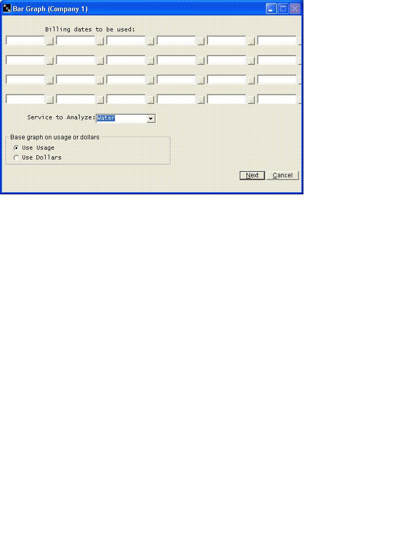 The Bar Graph option will allow you to print a bar graph of the usage or dollars generated by water, sewer, electric or gas services. You can pick any 24 dates to be used. The system will automatically fill in the last 24 billing dates. If you are on cycle billing, you will have to reenter the correct dates. You will also have to reenter the dates if you want anything older than the last 24 months.
