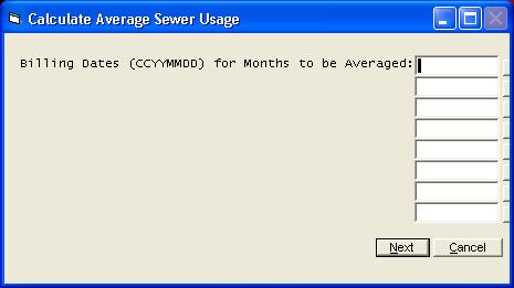 Many cities bill their residential sewer on an average usage method. They pick three or four winter months to arrive at an average usage, and then bill all year long based on this average usage, rather than the actual usage. If you use this method of billing for sewer usage, you will use this menu option once a year to calculate the new averages. This new average is stored in a field in the customer record called Average Sewer Usage. You can choose the billing dates for the months to be used in the calculation. If, for example, you are entering four different months and a new customer only has three of those months, the average will be determined by the number of months that the customer has been billed during the four months.. Use ccyymmdd format for entering the billing dates. If you should enter a wrong date and the averages are not correct, you can run this option a second or third time without causing any problems. If you have calculated the new bills before the problem is noticed, you can still recalculate the averages and the bills will be correct the next month. | |