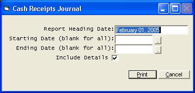 The Monthly Cash Receipts Journal reads from the transaction history file. You can print a monthly Cash Receipts Journal from this history at any during the month or year. This report is referred to as a Monthly Cash Receipts Journal since it would normally be run at month end as a record of all collections for the month, but it can be run for any time period. For example, if you have entered the daily receipts from several different terminals and would like to have one combined journal for the day, you can run the report in this manner. To get a Cash Receipts Journal, you would enter the first and last day of the month as the lowest and highest dates to print. If you choose details, you will get a complete list all collections for the time period broken down by each type of service. | |