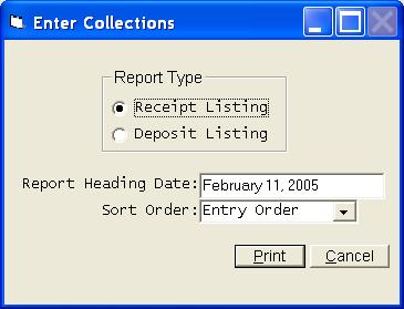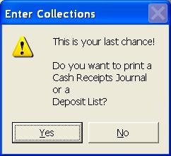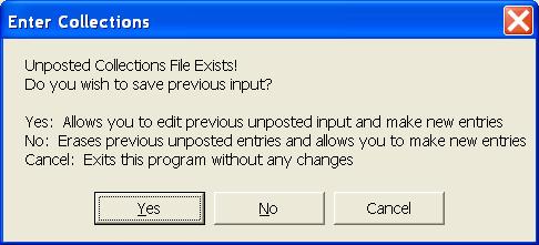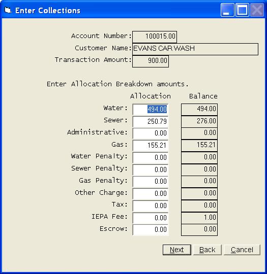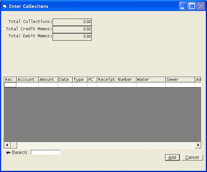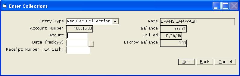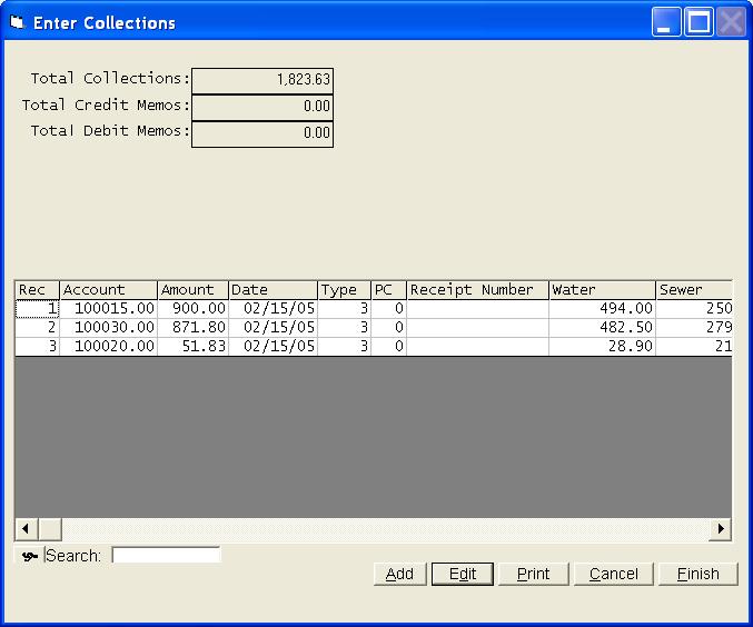 This selection will allow you to enter collections from customers. It will also allow you to enter Credit Memos and Debit Memos. The collections on any or all books can be entered at one time. The transactions will be stored in a temporary work file until all corrections have been made. The transactions will then be posted to each customer's account as you exit the collection program.. This program can be run at any time and you can run the program as many times as you desire. Ordinarily you will enter collections on a daily basis, but you can enter several days at one time. For ease of entry and control, you should consider entering your collections in batches that match your bank deposits. If you use this technique, your deposit should always agree with the Cash Receipts Journal produced by this program. The collections program begins with a blank grid. Click Add to begin entering collections. Selections can be made from the combo box or the search grid, but normally you will just begin entering the account number. You can press enter or click Next to proceed. The above screen is a sample of a regular collection. The date should be entered in MMDDYY format and will be retained from screen to screen. You will normally only enter the account number and the amount. Entry of the Receipt Number is optional and will only be used on the Receipts Journal. You can make the receipt number a mandatory entry by selecting that option in the Company Information File. In an effort of save you time, the amount owed is automatically written into the Amount paid field. This allows you to just press the Enter key and proceed to the next customer any time they are paying their total bill, but if some other amount is being paid, be sure to override the Amount field. You can process credit memos and debit memos by changing your selection in the combo box at the top of the collection screen. Please note that a new button has been added to this screen. It is Review Customer Records and allows you to review any customer record without having to exit the collection process. The system has been designed to maintain a separate balance for each type of service on each customer. As collections are processed, the system must know the breakdown of the collection in order to update the balance on each service. If the amount collected is equal to the total balance due from that customer, the program can simply allocate the collection based on the balance breakdown in the record. You will never see the above screen if the balance is collected in full, or if the customer is paying their last bill. If the collection amount is not equal to the current balance, the above screen will be presented. The collection amount must be allocated to the different services. The balance on each service will be updated to show the new balance as the collections are posted. Once all collections have been entered, you can take Finish and be returned to a grid of all collections. The proof totals are simply a total of all information entered in each category. If your totals do not agree with these totals, you can review the grid to find your mistake. Once you have located the error, highlight the entry and press enter or click Edit. The Print option above will allow you to get a Receipts Journal or a Deposit List. You should always print a Receipts Listing. This will be your record of the collections exactly as they were entered. You will take Finish on the collection grid screen once you are ready to post your collections. You will get one final chance to print your reports. Once you proceed from here, it will be to late to get a deposit listing. However, you can reprint your Receipts Journal by selecting Cash Receipts Journal from the Month End options. Your collections will be posted to each customer's account immediately as you indicate you do not want any more reports. If you take the Cancel option from the collection grid screen, you will exit without posting the collections. If you choose to exit without posting, your collection entries will be retained and upon returning to the collection program, you will be given an opportunity to continue working with the previous batch of unposted collections. | |