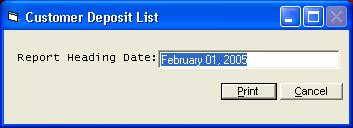 The customer deposit listing will show the dates and amounts of all deposits made by each customer. It is located under Miscellaneous Reports on the pull down menu. This report will be most useful to the bookkeeper and the auditor. It will assist in reconciling the deposit amounts in your General Ledger. This report can be run at any time, but normally you would run the report at the end of each month. You should consult with the bookkeeper in determining if and when the report should be run. For this report to be accurate, you must be very careful to place the correct deposit amounts in each customer's record as they are added to your master file. You will normally enter the date the report is being run for the Report Heading Date. | |