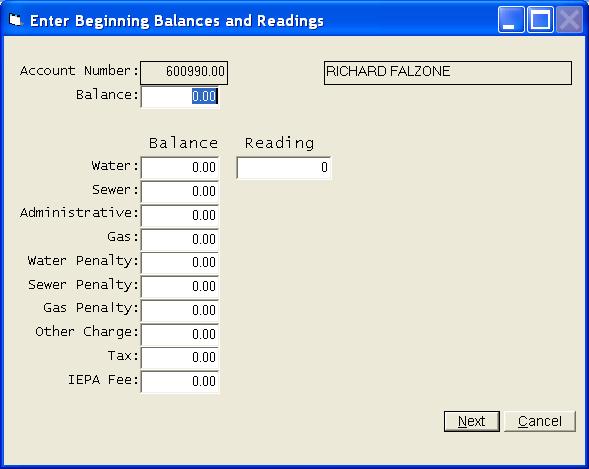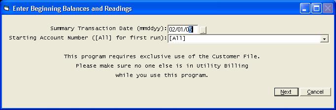 This program can be found under utilities. It will allow you to enter the current meter readings, year-to-date usage and the current account balance into each customer record. It has been designed for use when you first begin using the system. It would most often be used when you have failed to get a book or route set up in time to send the bills out by computer and have been forced to use your old system. The reading and balances in your files have then become outdated. To correct these items using regular file maintenance would require much time. This program will read through the Customer File and request the readings and balances on each customer. You may even want to consider building your initial files without the balances and meter readings, and then plan to use this program just prior to your first billing cycle. By using this technique, you would not have to worry about processing collections, new charges, etc. as you are building your files. You would simply update your files immediately before the first bills are calculated. To run this program click on Utilities on the Utility Billing Menu. Then locatee Enter Beginning Balances and Readings. The only disadvantage to using this program is that it will only write one summary transaction for each customer's balance. It will not allow you to enter all transactions for each customer's balance, thus aging will be off until these transactions become more than 90 days old. This program has been designed so you do not have to make all changes at one sitting. The first time you run the program, the transaction file will be cleaned, and the computer will start with the first customer in the file. If you have previously made changes using this program, you must select where to begin or the system will again start you at the beginning of the file. The system will automatically read the master file in numeric order and display each customer's record on the screen. You can then enter the new information. Once all information has been entered on the customer you should press Enter or click on Next. If you need to stop the program before it reaches the end of the file, you can take Cancel. You will then be returned to the Utility Billing Menu. | |