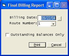 The Final Billing will list all customer who have a final billing code in their record. The final billing code is used to identify those customers who have become inactive. You can run this report in one of two ways. If you enter a billing date, the report will be limited to those customers who had final billing codes entered during this billing cycle and received their final bill this month. The second option would be to leave the billing date blank. This report would then list all customers in your files whose record contains a final billing code. You can further limit the report to only those final billed customers who still owe money. The report can be run at any time. It could be used to make sure all customers who should have been finalized have been, or that no active customers have inadvertently been coded with a final billing code. | |